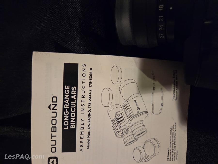 Jumelles Outbound de très grande qualités . Ces jumelles ont un bon poids, mais sont puissantes. Model Nos 1175-2439-0 9X-27X50 Viennent avec Étuis et protecteurs de lentilles + instructions. État neuf. Maison non-fumeur J'habite Kirkland